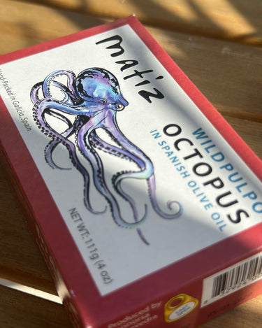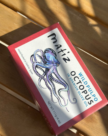 Matiz Wild Pulpo (Octopus) features tender octopus pieces caught in the open waters of the Atlantic, hand-processed and packed in Galicia, Spain. Its soft texture and rich ocean flavor make it ready to enjoy straight from the tin.