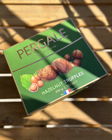 Pergale Hazelnut Truffles combine rich chocolate with a smooth hazelnut filling. Each truffle is coated in fine chocolate that gently melts, revealing the nutty taste of roasted hazelnuts and a perfectly balanced sweetness.